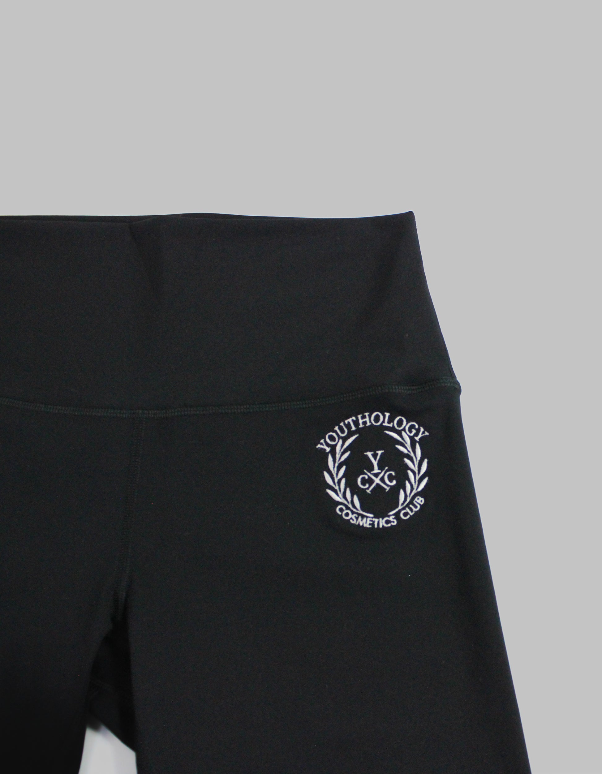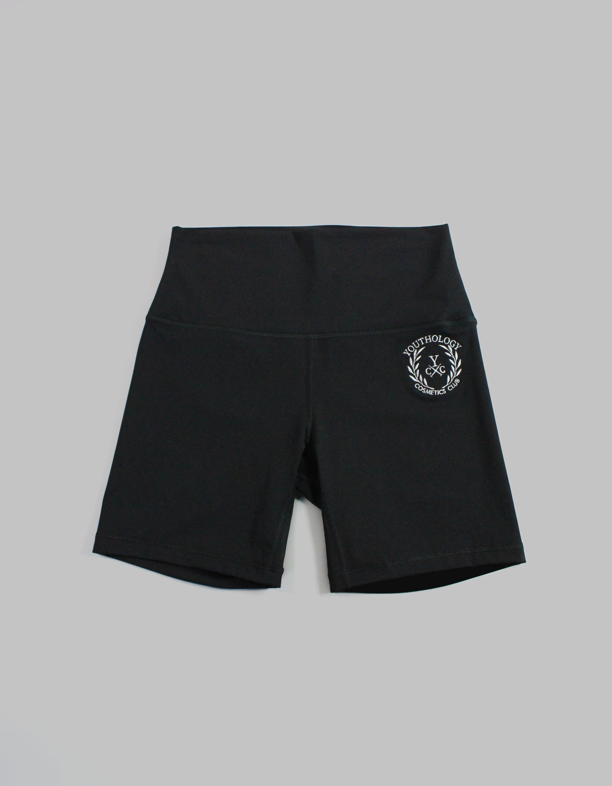 Black Youthology Cosmetics Club high-wasted biker shorts.